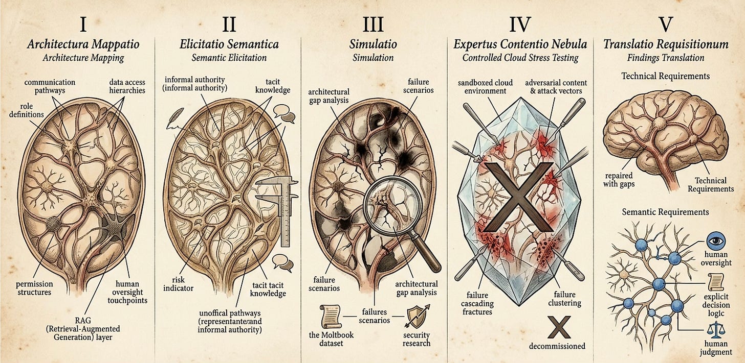 The third stage is simulation. The architecture map and semantic elicitation findings are run through failure scenario models derived from the Moltbook dataset and the security research literature. The output is an architectural gap analysis identifying where the current design has no response to specific failure classes and where semantic gaps create decision voids that agents cannot resolve without tacit knowledge they do not have.